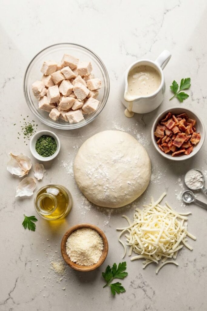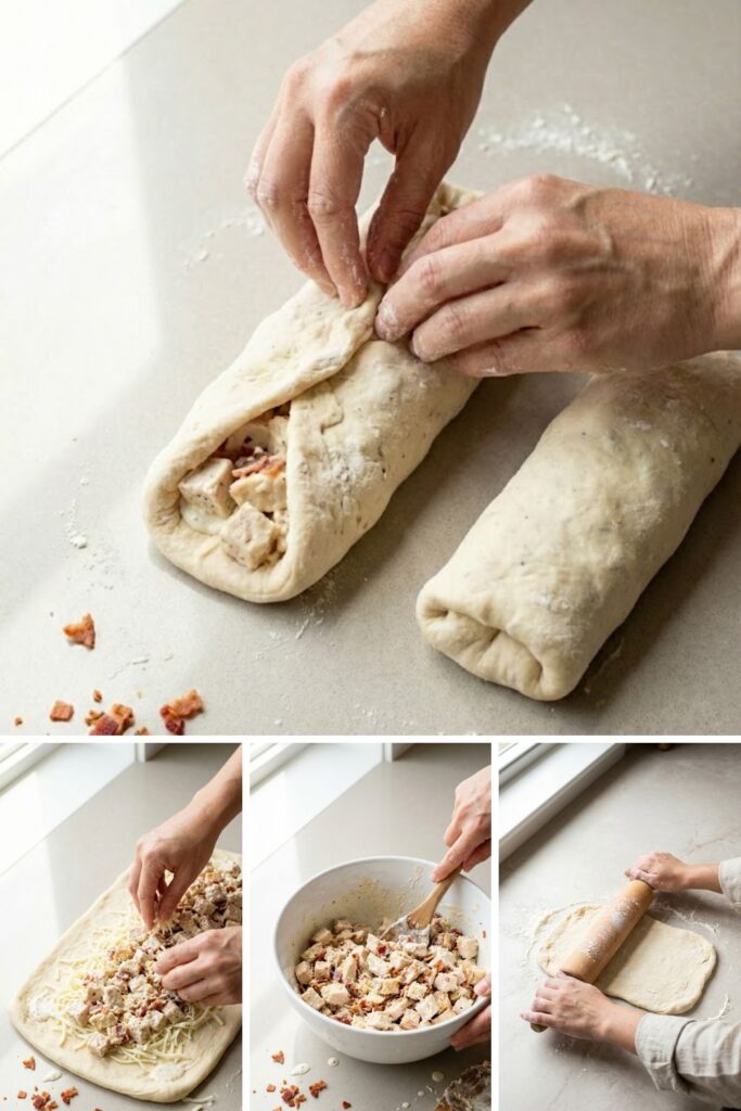 - Fill the bakes: Sprinkle a layer of shredded Mozzarella cheese down the center of each dough rectangle, leaving about an inch of space at the edges. Top the cheese generously with the chicken and bacon mixture.