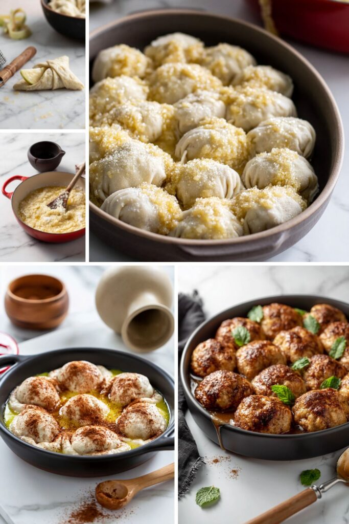 Cool the dumplings completely, wrap tightly in clingfilm and foil, and freeze for up to 2 months. Defrost overnight in the fridge and reheat as directed above. The pastry won’t be as flaky after freezing.