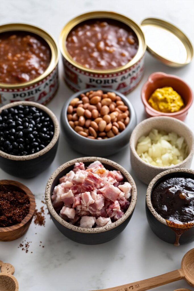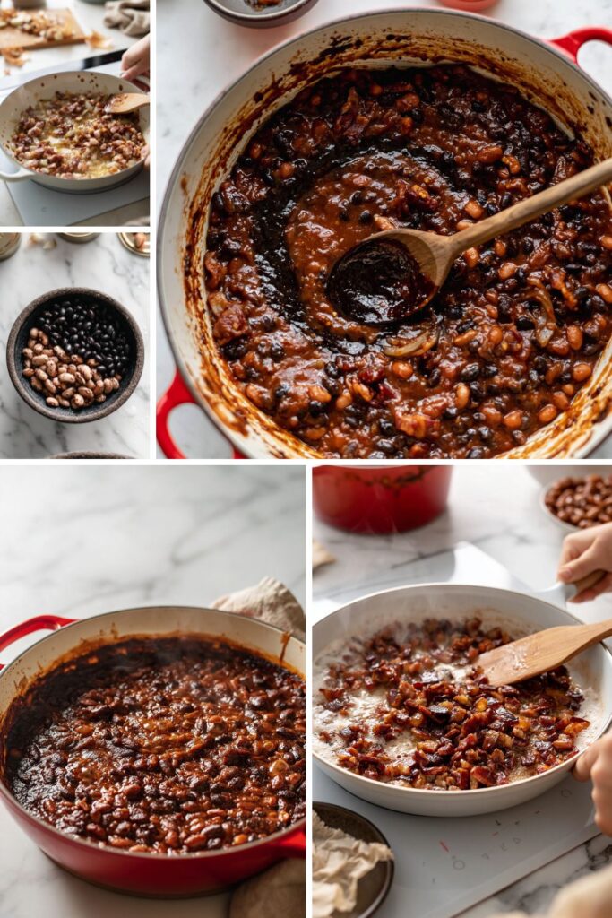 - Prep the beans: Rinse and drain the black beans and pinto beans in a colander under cold water. Do not rinse the pork and beans because the thick tomato-based sauce they come in is the foundation of your bake. Pour all the beans into a large oven-safe Dutch oven or heavy casserole tin.