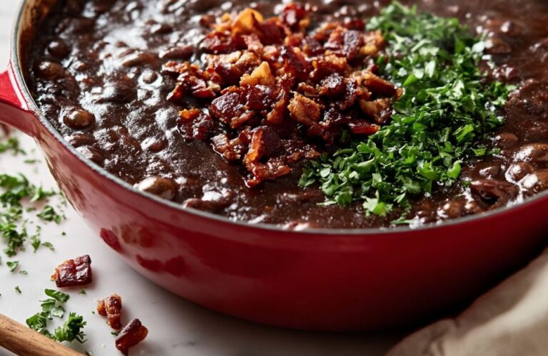 Cracker Barrel Bacon Baked Beans Recipe is a smoky American side dish featuring pinto beans, black beans, and sweet molasses. This hearty bake uses salty bacon, yellow mustard, and brown sugar to create a thick, savoury sauce that pairs with any grilled meat.
