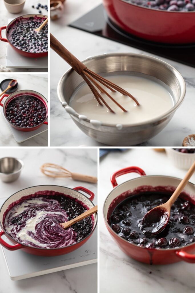- Thicken: Turn off the heat. Pour the cornflour slurry into the hot blueberry mixture whilst stirring constantly. Let it sit in the warm pot for about 5 minutes. As it sits, the mixture will transform from thin juice into thick, glossy syrup that coats the back of a spoon.
