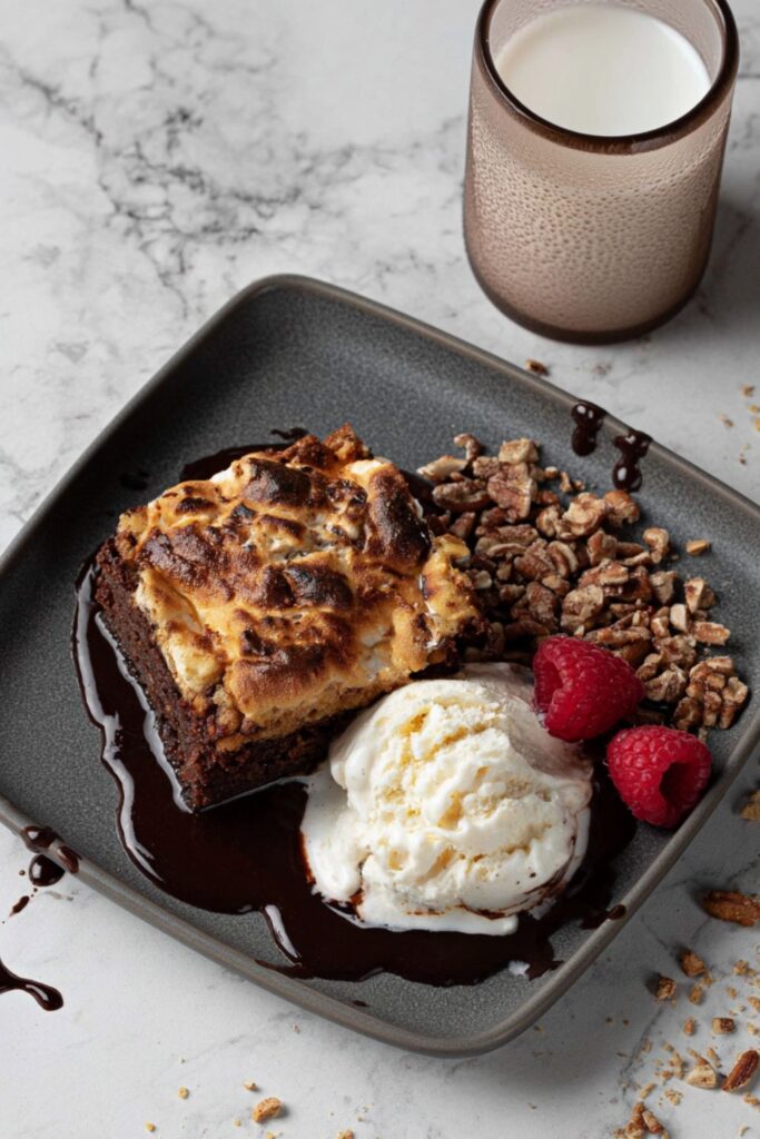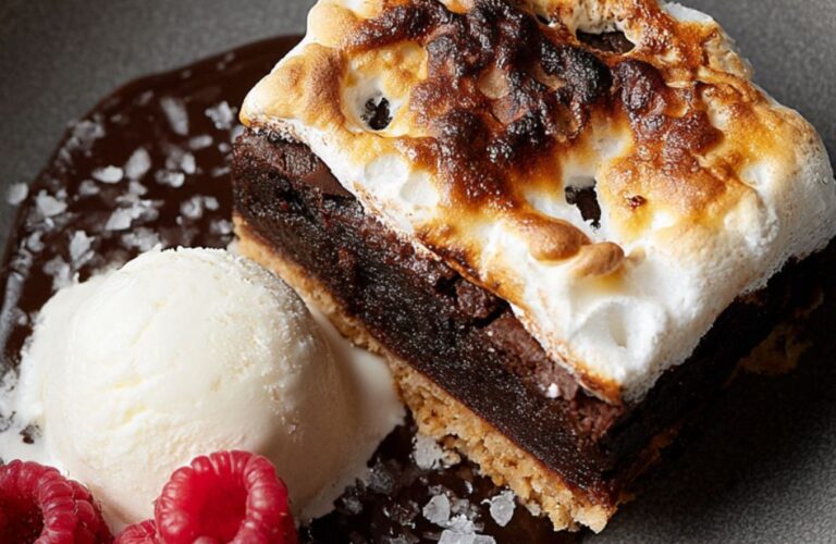 Campfire S’mores Brownie Recipe is an American-style dessert featuring a buttery graham cracker base, fudgy chocolate, and toasted marshmallows. This decadent treat uses Hershey’s bars and vanilla ice cream to create a warm, gooey campfire experience indoors.