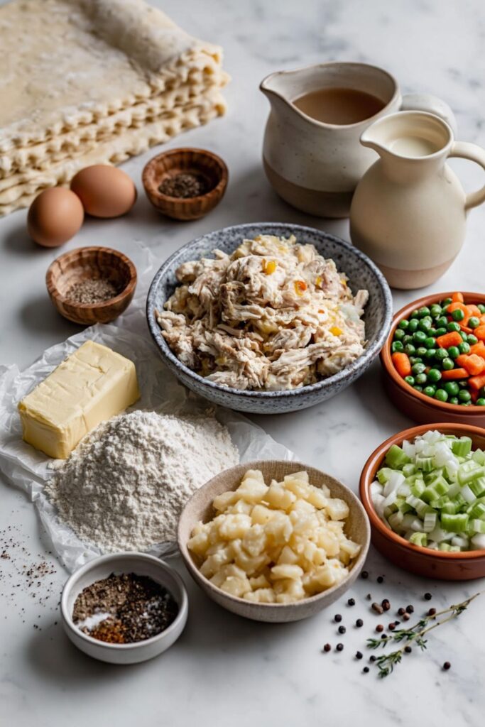 - Mix the filling: Add the cooked chicken, boiled potatoes, and frozen peas and carrots into the sauce and stir gently to combine. Take the pan off the heat immediately to prevent the vegetables from turning into mush.