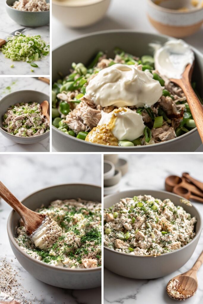 - Season and mix: Sprinkle in the seasoned salt, black pepper, and fresh dill. Using a spatula or large spoon, mix everything together gently but thoroughly. Continue folding until every piece of chicken is evenly coated in the dressing and the mixture looks glossy.