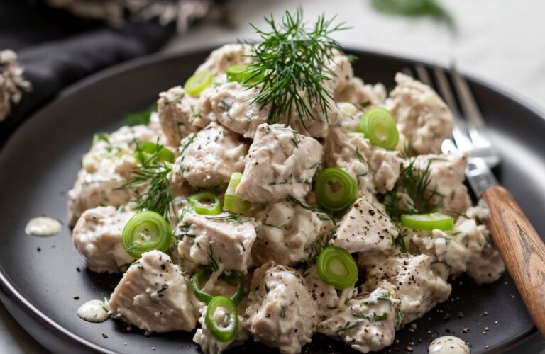 kcalCreamy chicken salad with chopped chicken, mayonnaise, celery, spring onion, Dijon mustard, and fresh dill for sandwiches or lettuce cups.