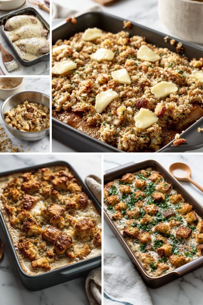 - Assemble and dot: Spread the moistened stuffing in an even layer over the sauce-covered chicken. Arrange the thin butter slices across the top of the stuffing to help it brown.