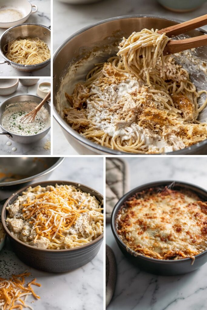 - Combine: Add the warm spaghetti and the shredded chicken to the bowl with the sauce. Use tongs to toss the ingredients until the pasta is completely covered in the cream mixture.