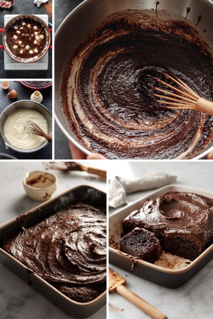 The marshmallows are doing more work than you’d think in this batter. They don’t stay whole; they melt down to create a unique, tacky texture that keeps the sponge from becoming crumbly. This is one of those recipes that looks harder than it is, but once you see that glossy frosting set, you’ll never go back to standard chocolate cake.