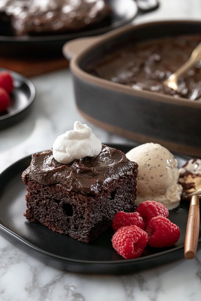 This heavy, dark cake is best paired with a scoop of vanilla bean ice cream or a dollop of cold whipped double cream. The coolness cuts through the sugary fudge topping.