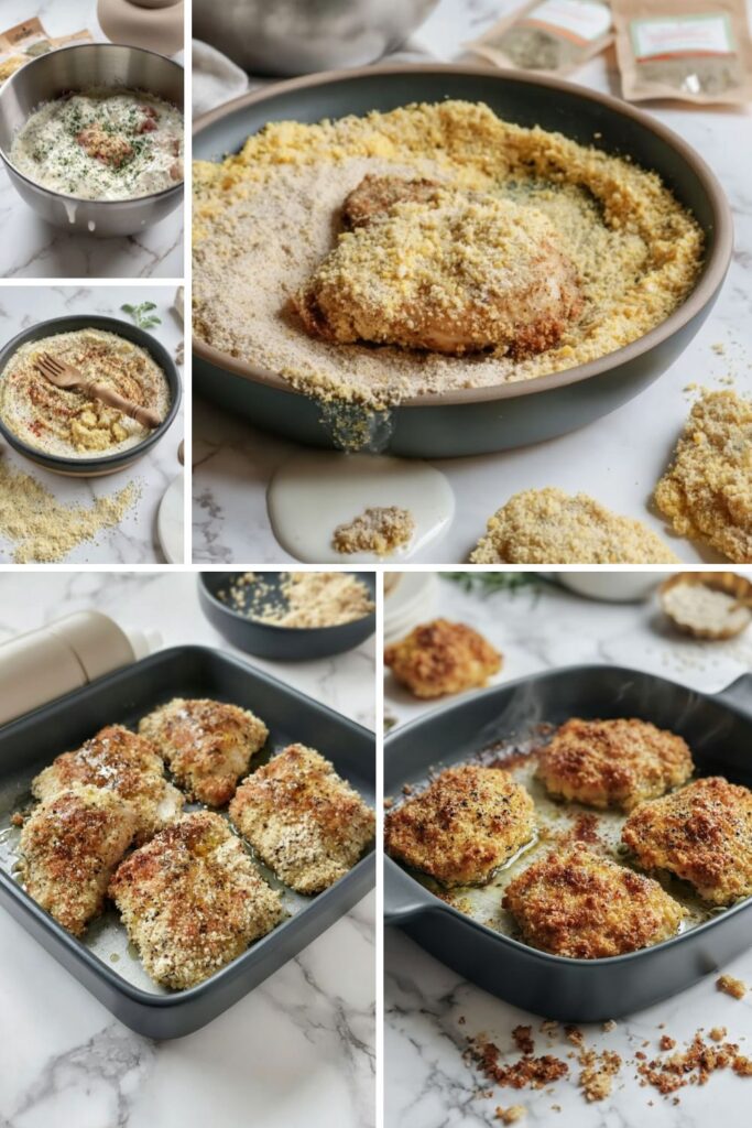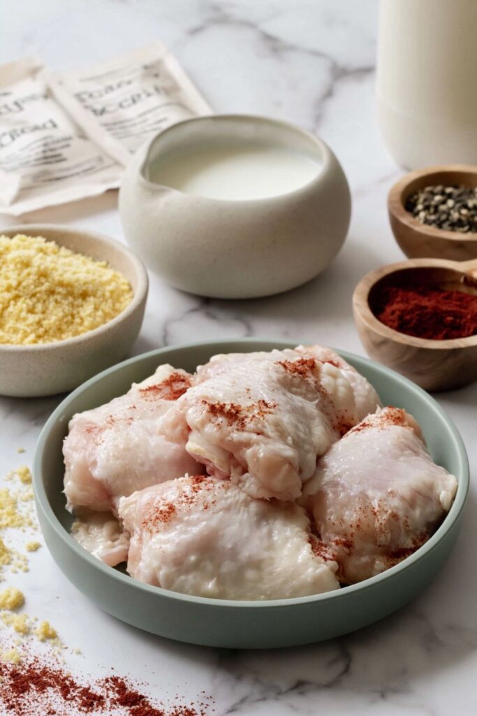 - Marinate the chicken: Place the chicken pieces, buttermilk, and ranch dressing mix into a large bowl or zip-top bag. Turn the pieces to coat them fully and leave in the fridge for at least 1 hour or overnight.
