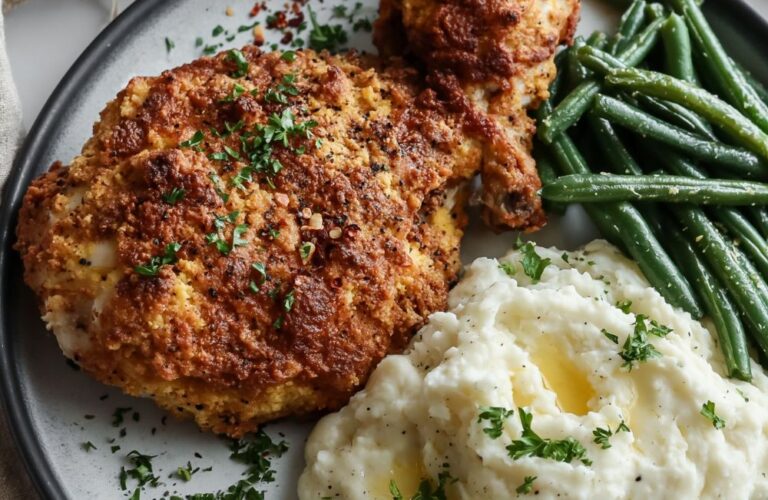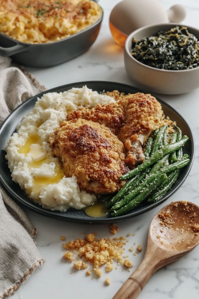 This crunchy chicken goes best with classic Southern sides like creamy mashed potatoes and buttered green beans. You can also add a side of coleslaw or some steamed corn on the cob to round out the meal.