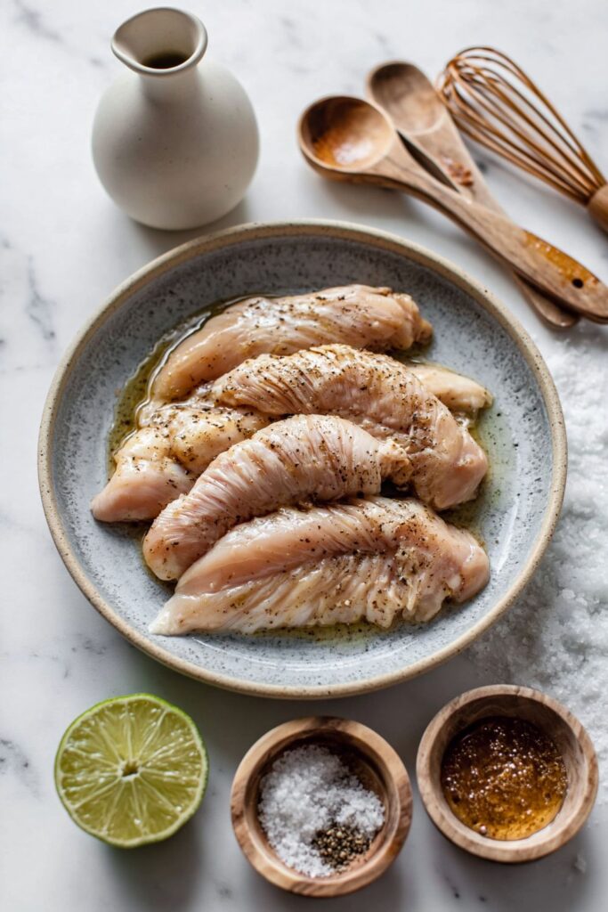 - Marinate the chicken: Place the chicken tenders into a large glass bowl or sealable bag and pour the mixture over the top. Turn the pieces until they are fully submerged, then cover and chill in the fridge for at least 1 hour.