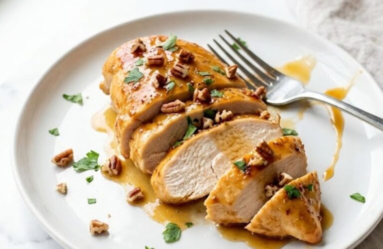 kcalJuicy pan-seared chicken breasts smothered in a buttery, sweet, and tangy maple syrup glaze, often topped with crunchy pecans.