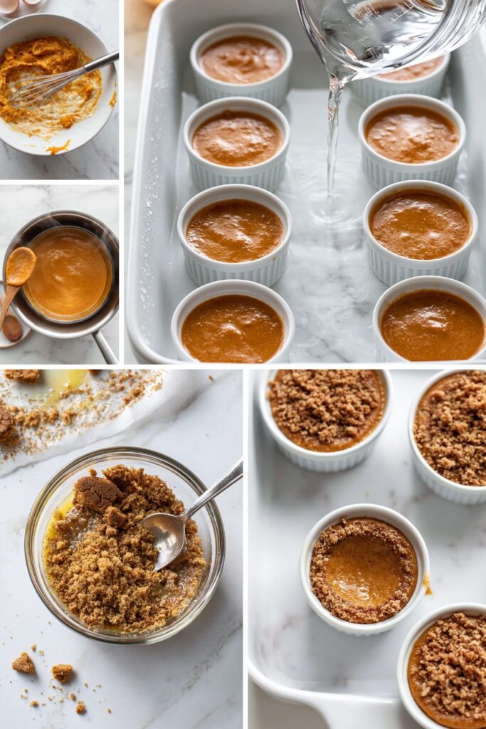 - Bake the custards: Divide the warm pumpkin mixture equally between the ramekins and fill the outer baking tin with hot water until it reaches halfway up the sides of the dishes. Bake for 20 to 25 minutes until the edges are stable.