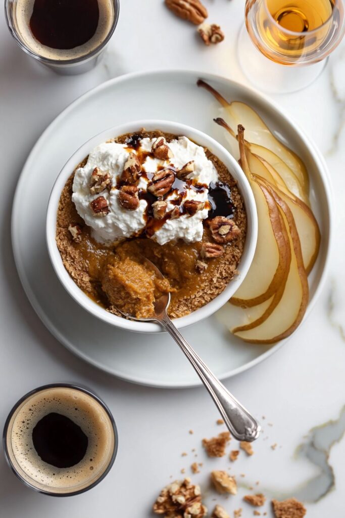 If you want more fruit, a few slices of fresh pear poached in apple juice work well with the spices. A drizzle of dark maple syrup over the whipped cream is another way to lean into those autumn flavours.