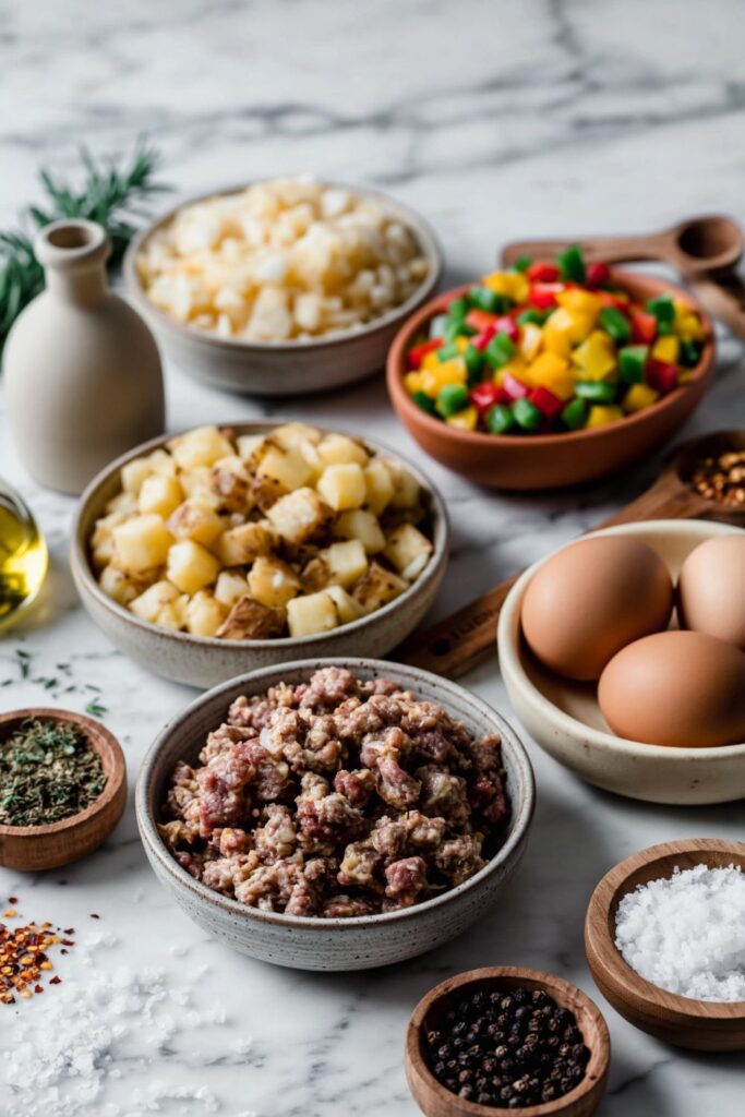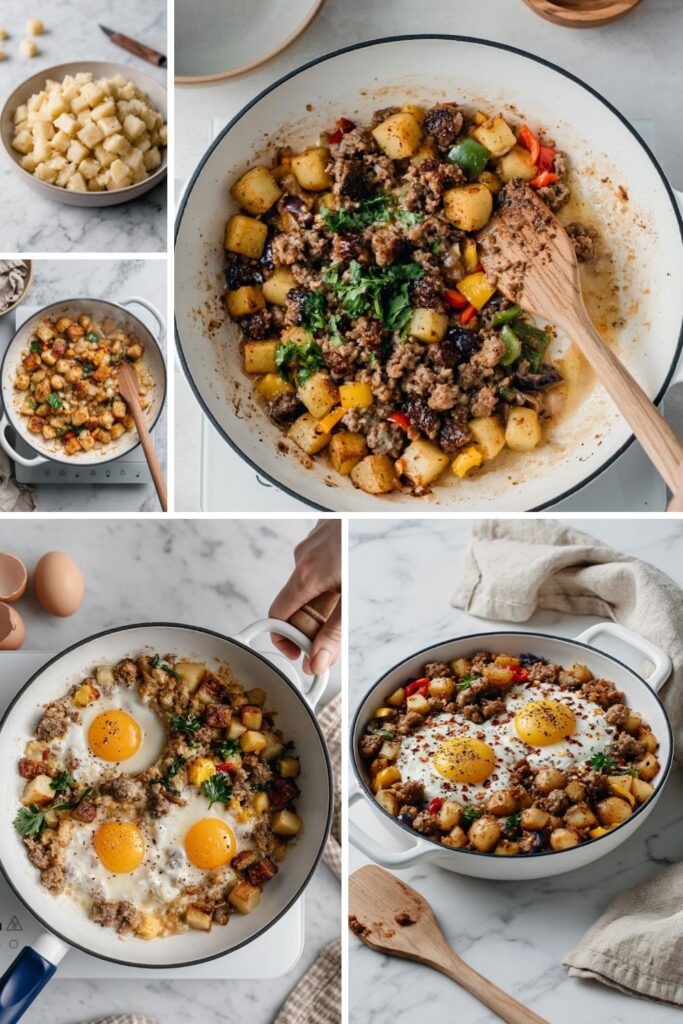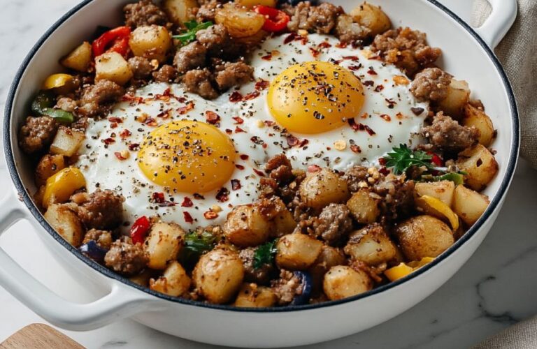 Cracker Barrel Sausage and Egg Skillet is a hearty American breakfast featuring crispy diced potatoes, savoury breakfast sausage, and golden eggs. This one-pan meal uses bell peppers, onions, and red pepper flakes for a satisfying morning start.