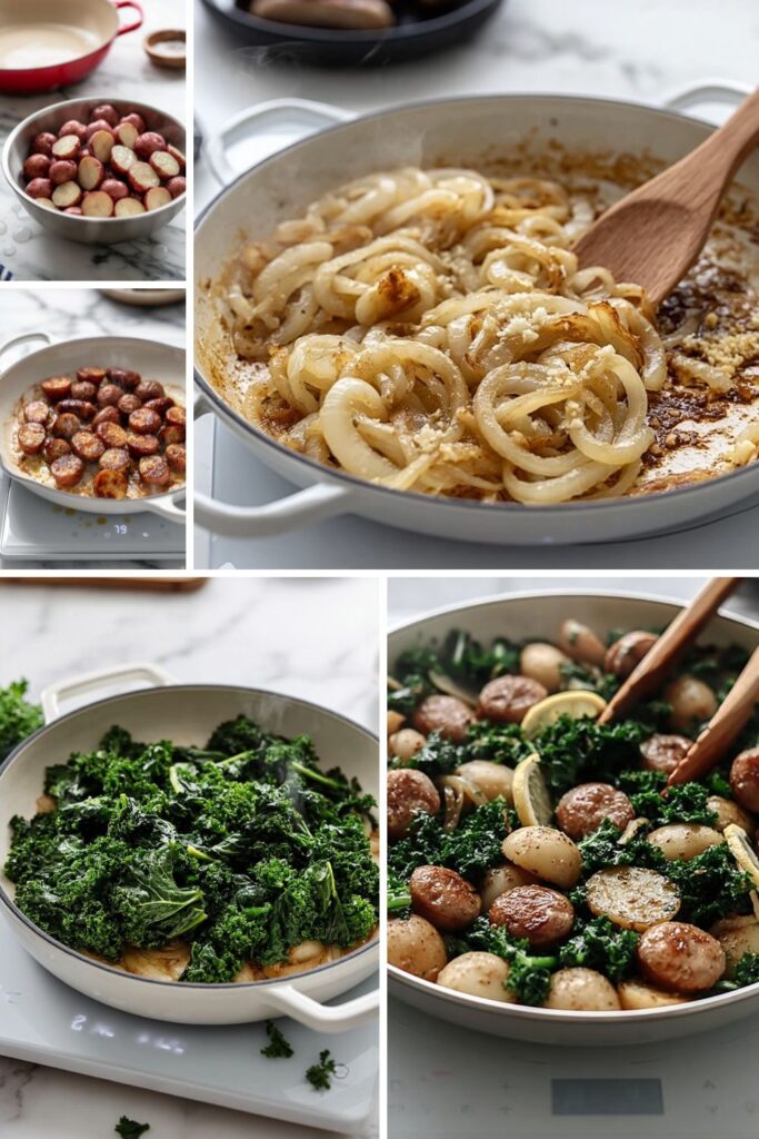 - Bring it all back together: Tip the crispy potatoes and browned sausages back into the skillet with the kale. Toss everything gently with tongs to combine the flavours without mashing the softened potatoes. Heat the mixture through for 2 minutes.
