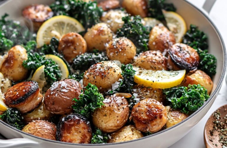 kcalA vibrant one-pan skillet meal with crispy gold potatoes, savoury chicken sausage, and wilted greens finished with bright lemon.