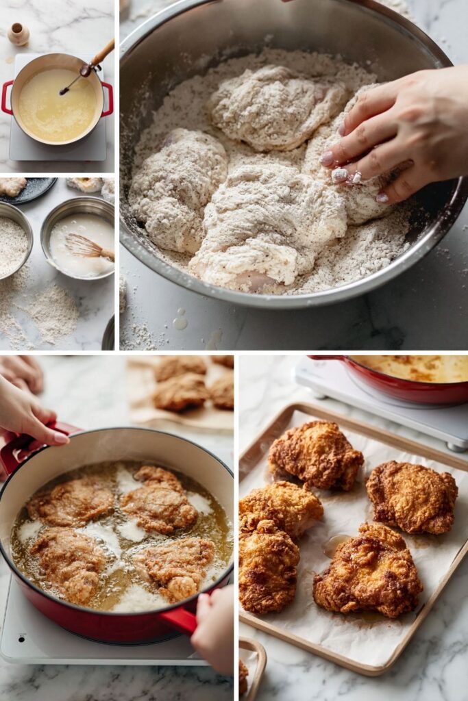 - Double-dredge chicken in flour, then buttermilk, then flour again, pressing firmly.