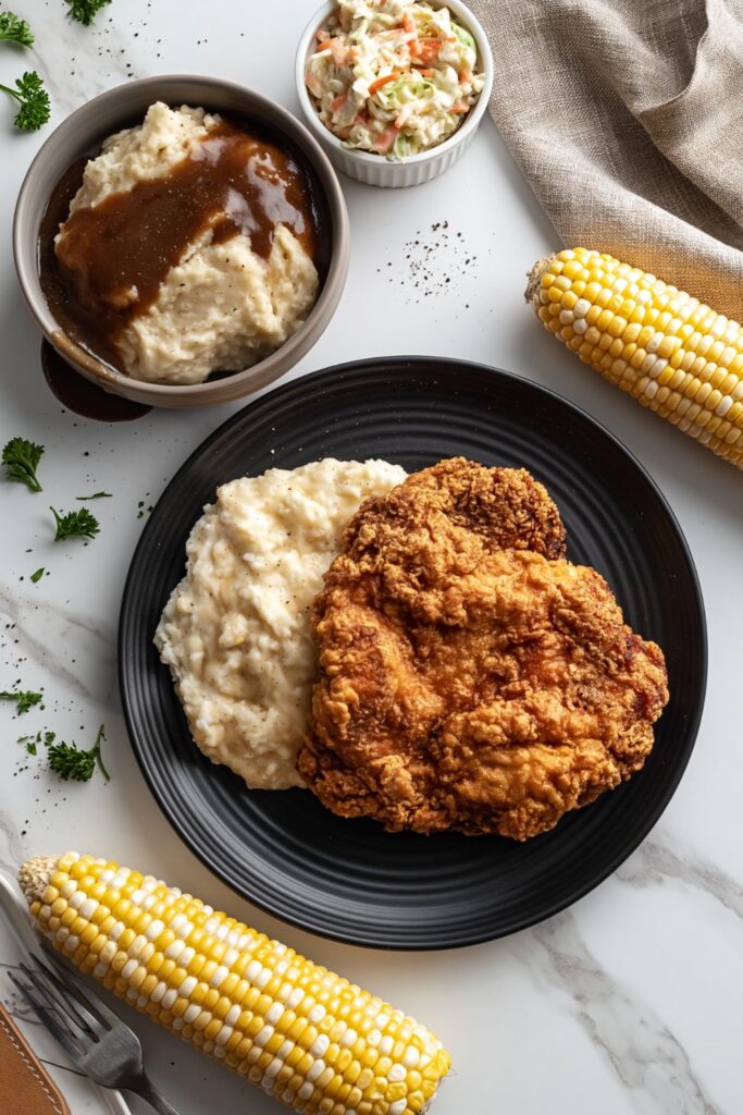 This chicken goes best with creamy mashed potatoes and a thick gravy. Add some buttered corn on the cob or a cold, crunchy coleslaw to cut through the richness of the fried coating.