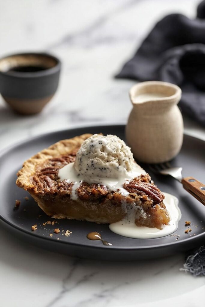 This rich dessert needs something sharp or plain to balance the intense sweetness of the corn syrup. A dollop of unsweetened whipped double cream or a scoop of high-quality vanilla bean ice cream works best.