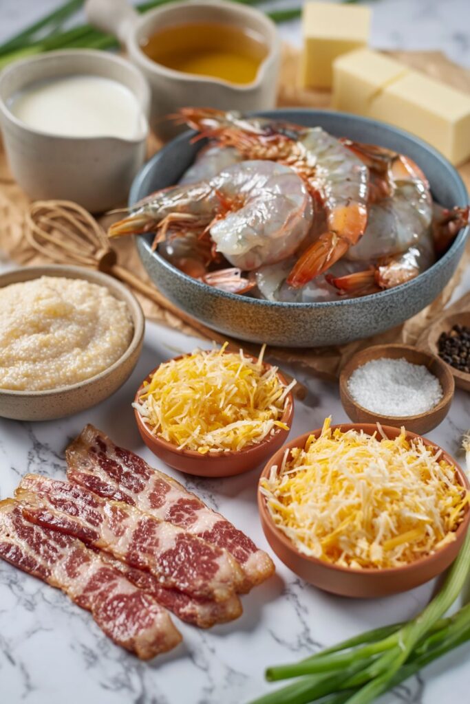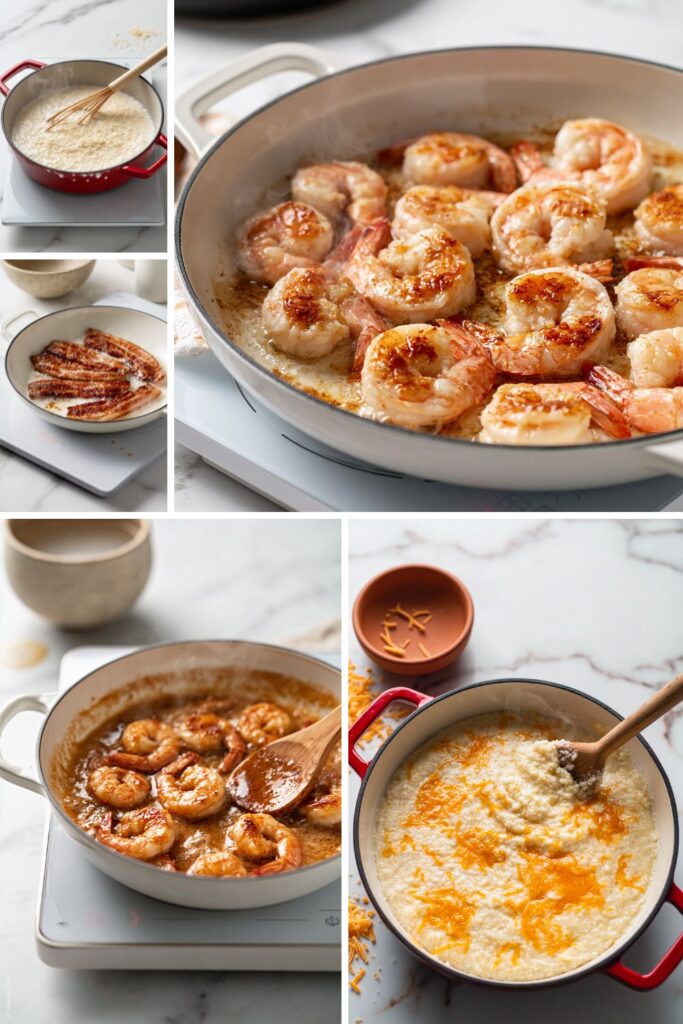 - Plate and serve: Spoon the cheesy grits into shallow bowls and top them with the sautéed shrimp. Drizzle the buttery pan sauce over the top, crumble the crispy bacon over the dish, and scatter with chopped spring onions.