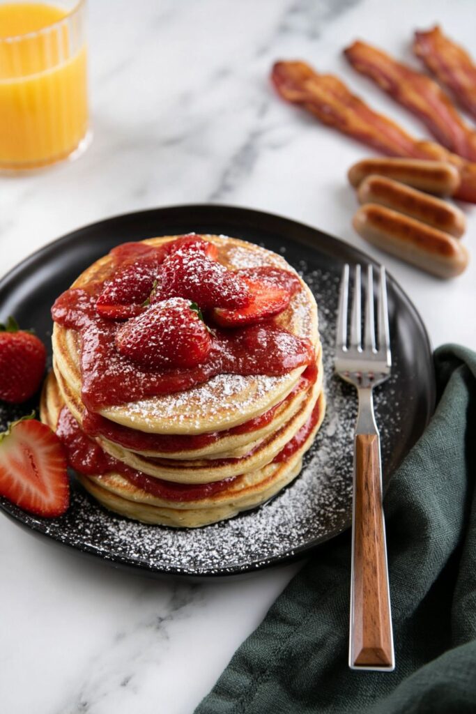 They also fit alongside crispy bacon or sausages for a full breakfast spread. The savoury meat balances the sweet pancakes without competing with them.