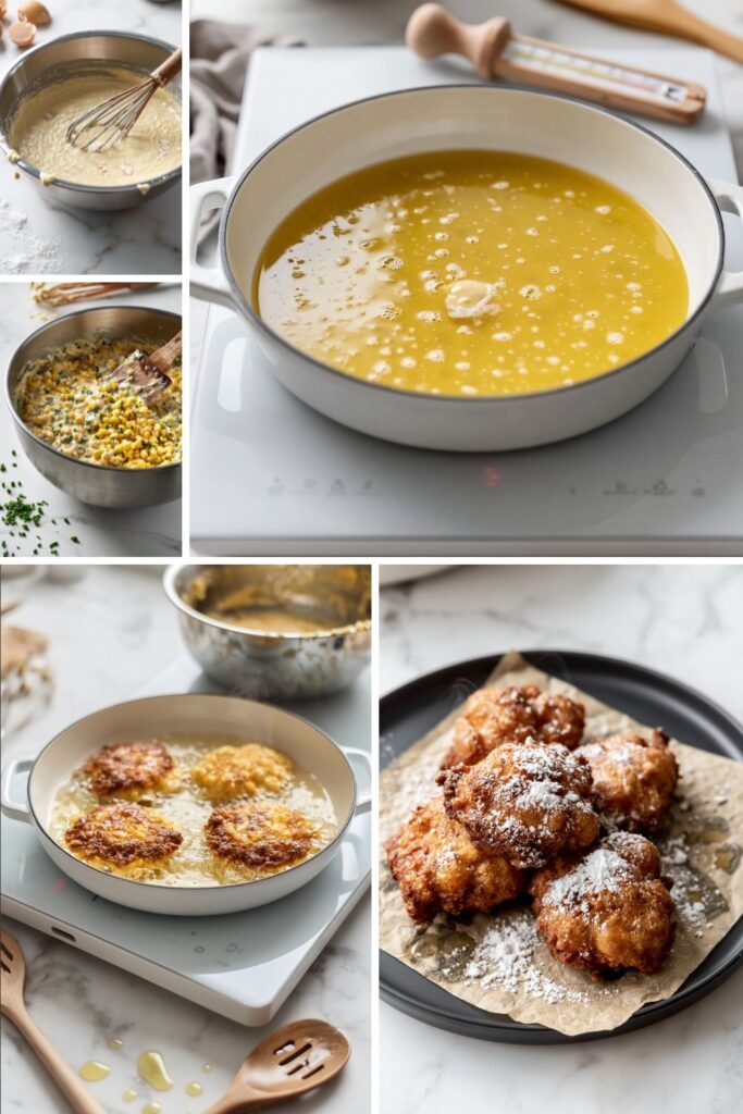 - Fry in small batches. Putting too many fritters in the pan at once drops the oil temperature too fast. Cook four or five at a time to keep the heat consistent and ensure they have room to puff up.