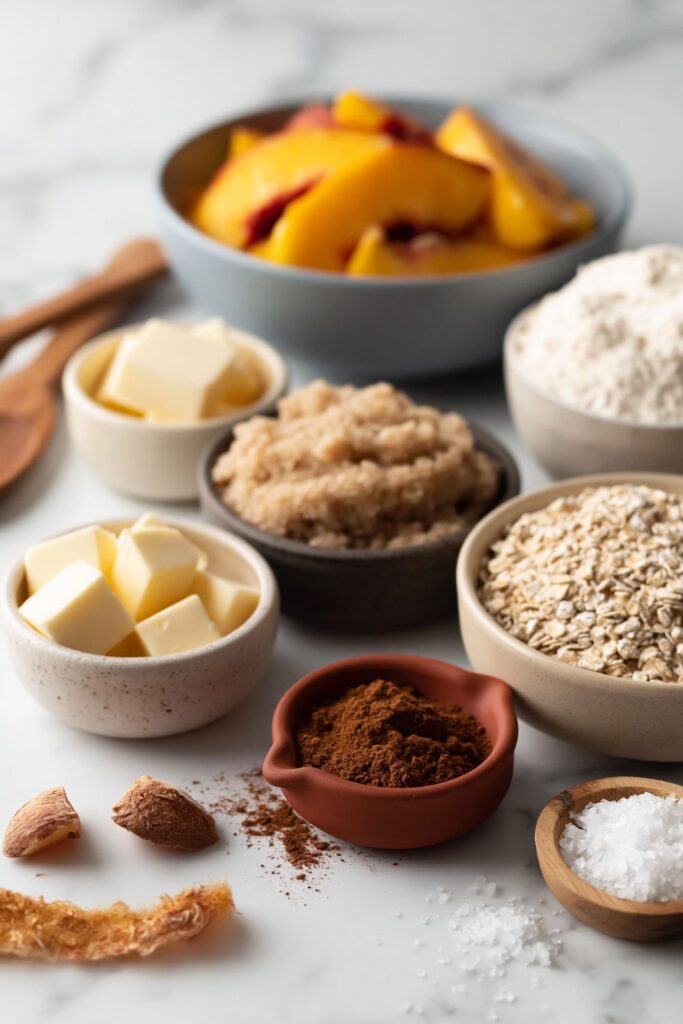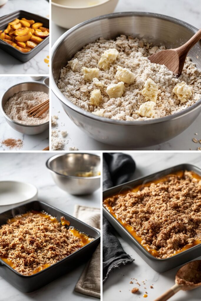 - Assemble: Scatter the oat mixture over the peaches until they are completely covered. Press down very lightly with your palms so the topping stays in place but doesn’t get packed too tightly.