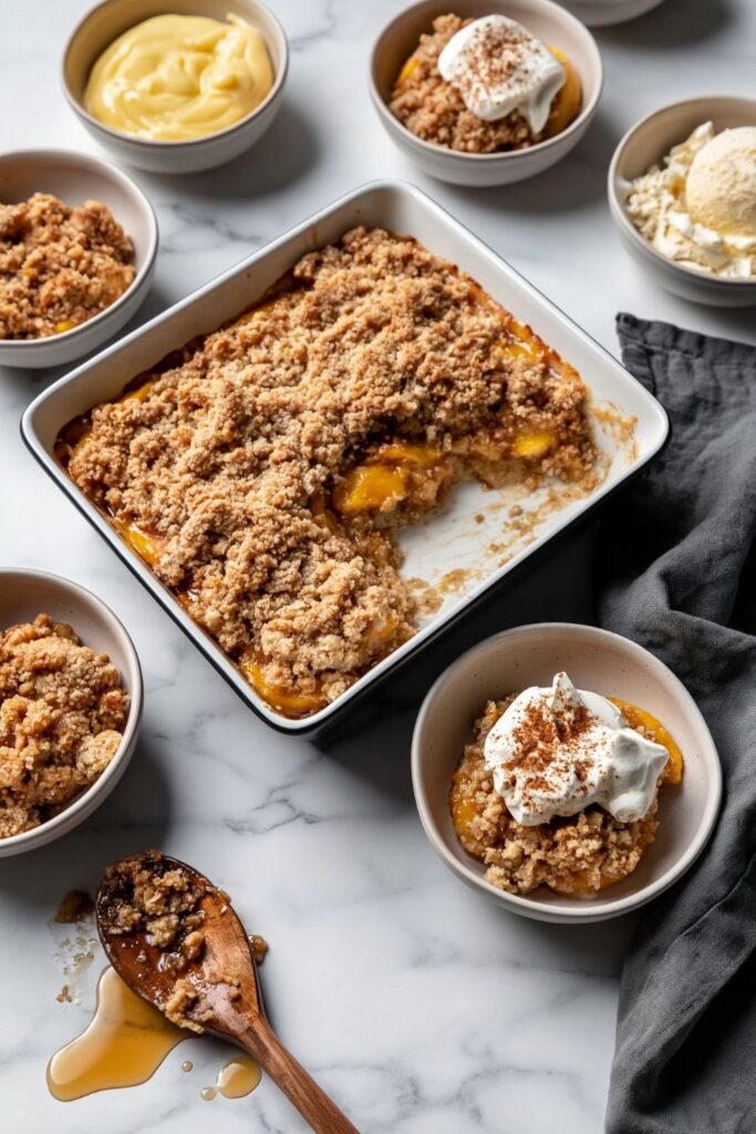 kcalA classic fruit dessert featuring tender sliced peaches topped with a crunchy, cinnamon-spiced oat crumble.
