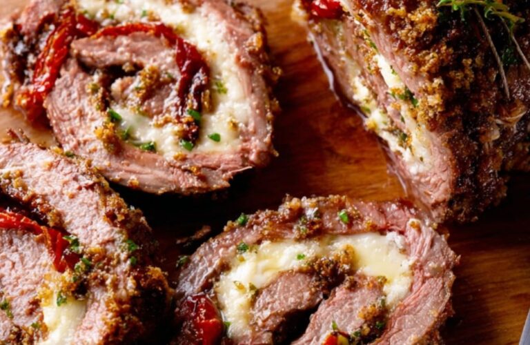 Elevate your Sunday roast with this spectacular Horseradish-Crusted Steak Roulade, a dish that looks incredibly intricate but is surprisingly achievable at home. Tender flank steak is pounded thin and spiraled around a vibrant filling of smoky roasted red peppers, sautéed leeks, and melting provolone cheese. The crowning glory is the zesty horseradish and herb breadcrumb crust, which bakes into a golden, crunchy exterior that contrasts perfectly with the juicy, medium-rare meat inside.
