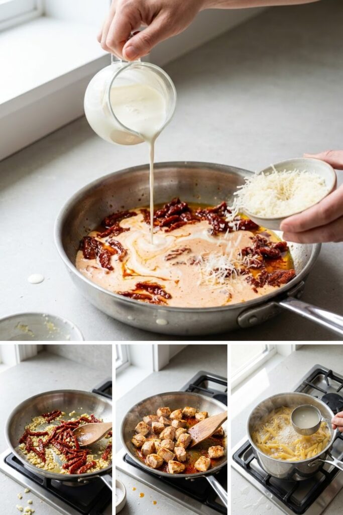 - Sear the Chicken: While the pasta cooks, heat 1 tablespoon of the reserved sun-dried tomato oil in a large skillet over medium-high heat. Season the chicken pieces with half the salt, pepper, and Italian seasoning. Add chicken to the pan in a single layer and cook for 5-6 minutes until golden brown and cooked through. Remove chicken to a plate.